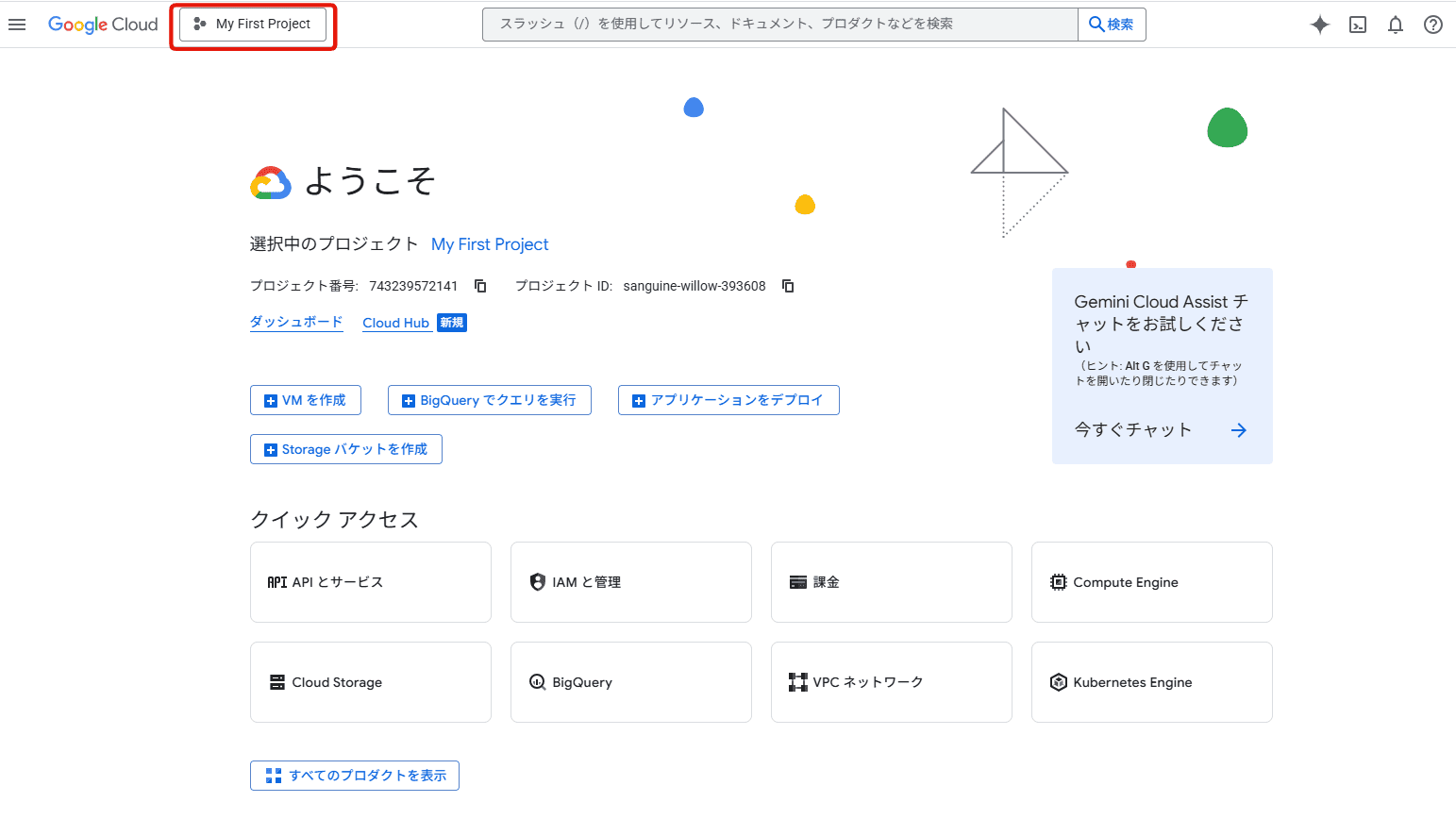 Google Cloudにログインし、画面上部の「My First Project」をクリック