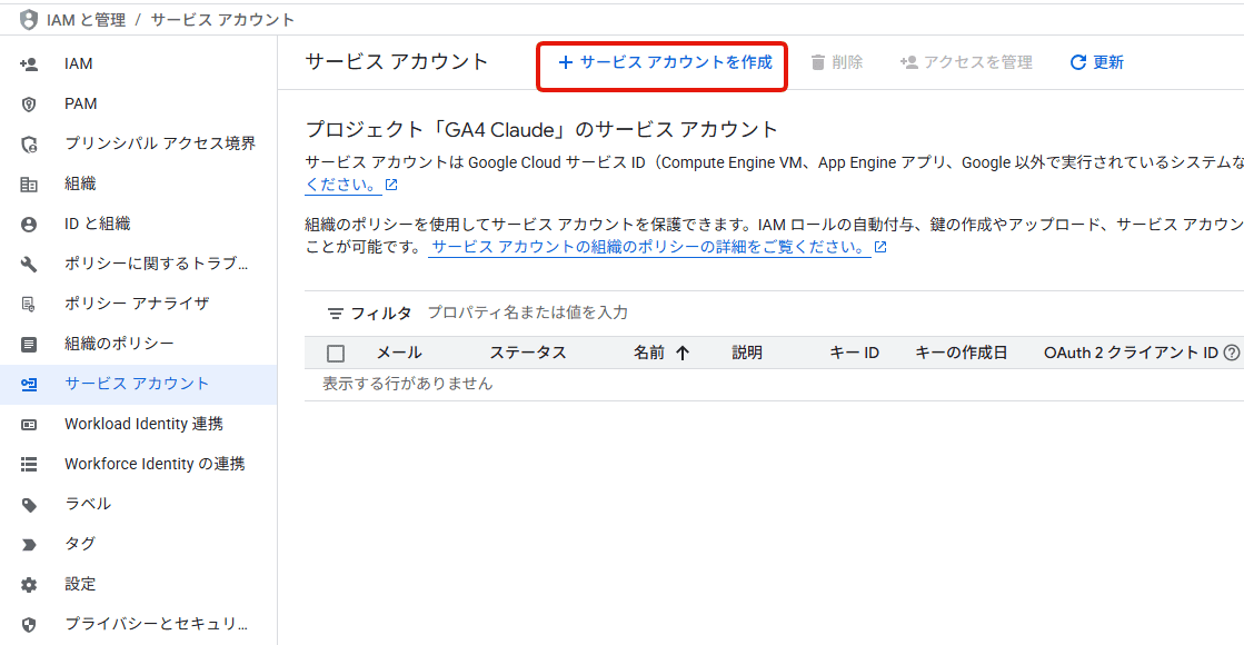 画面上部の「+ サービスアカウントを作成」をクリックします。