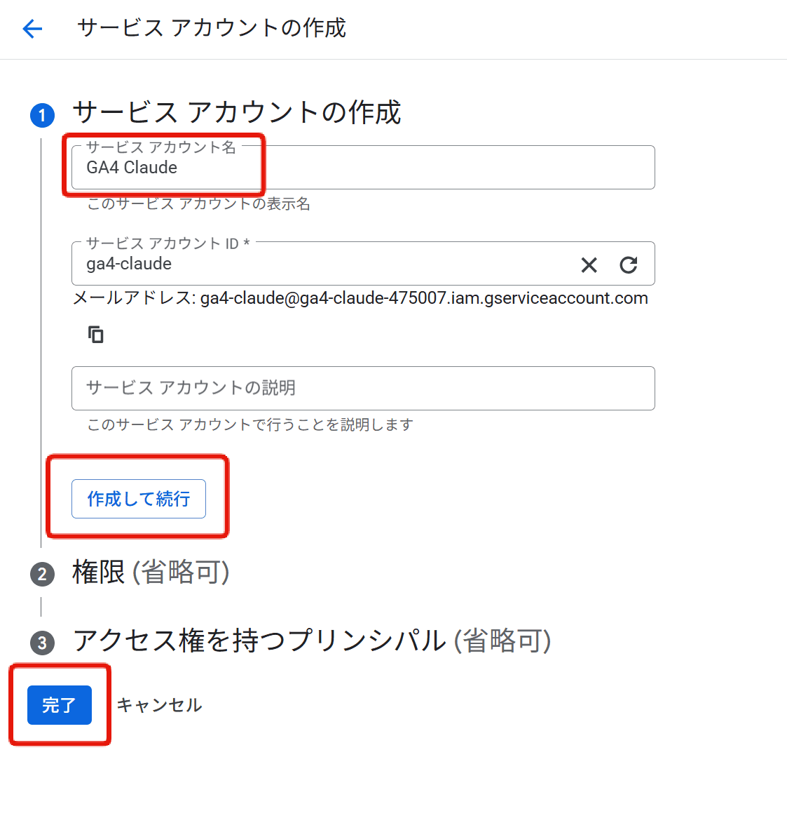 「サービスアカウント名」に分かりやすい名前(例:GA4 Claude)を入力し、「作成して続行」をクリックします。