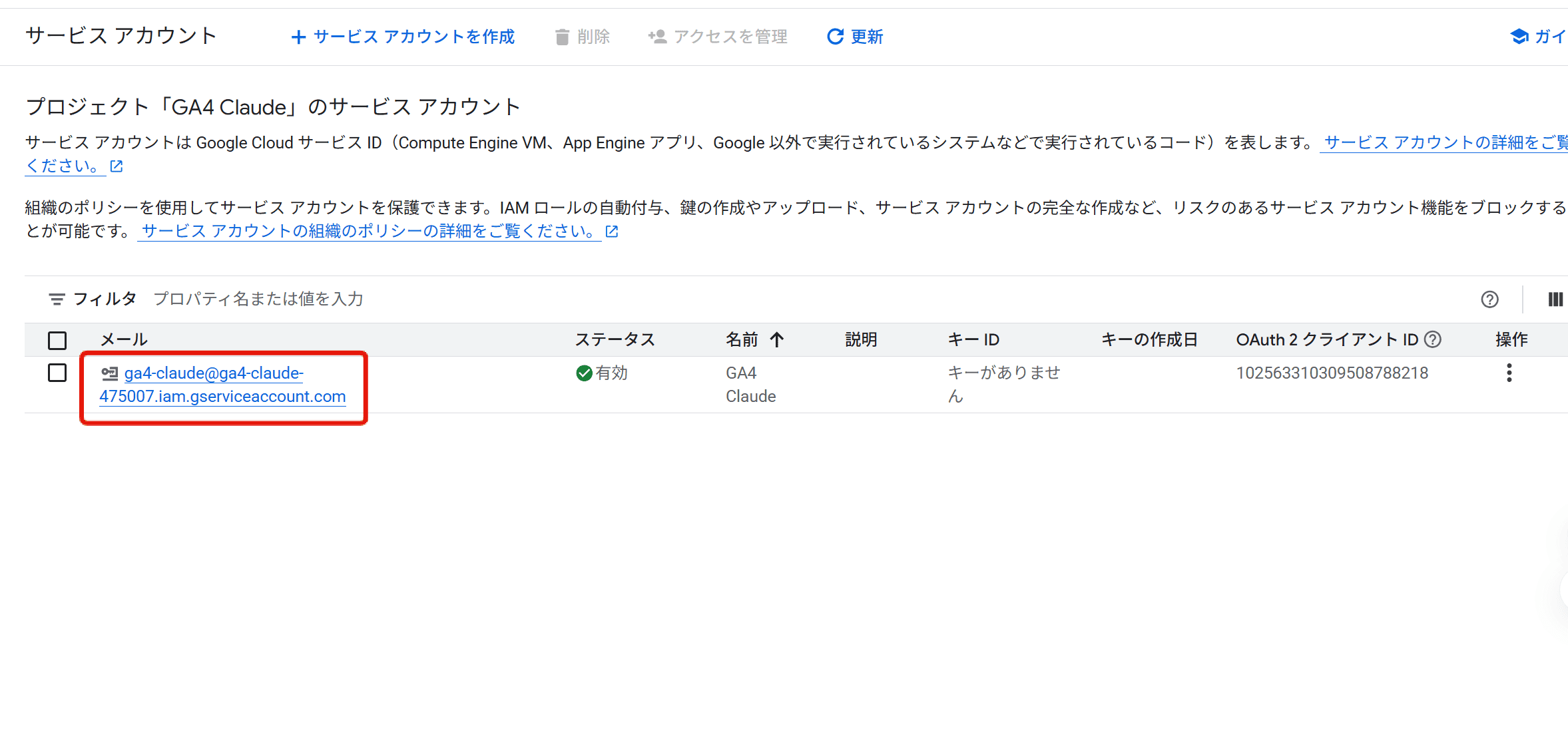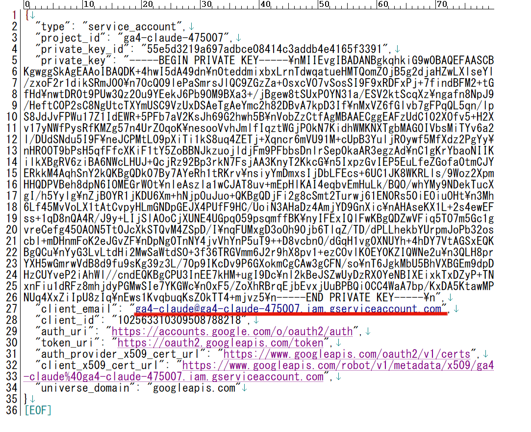 client_emailの項目に記載されているメールアドレス(例:claude-analytics-access-2@…iam.gserviceaccount.com)をコピーします。