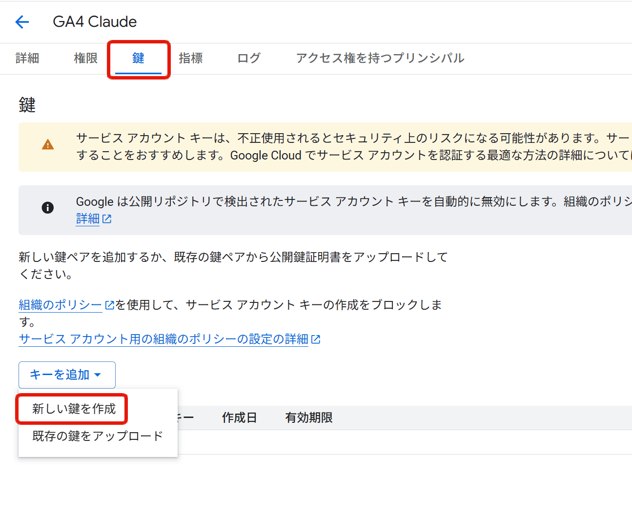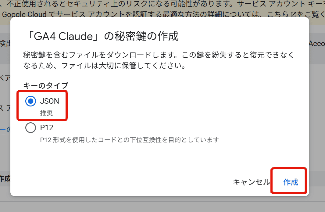 キーのタイプとして「JSON」が推奨されているので、これを選択して「作成」をクリックします。