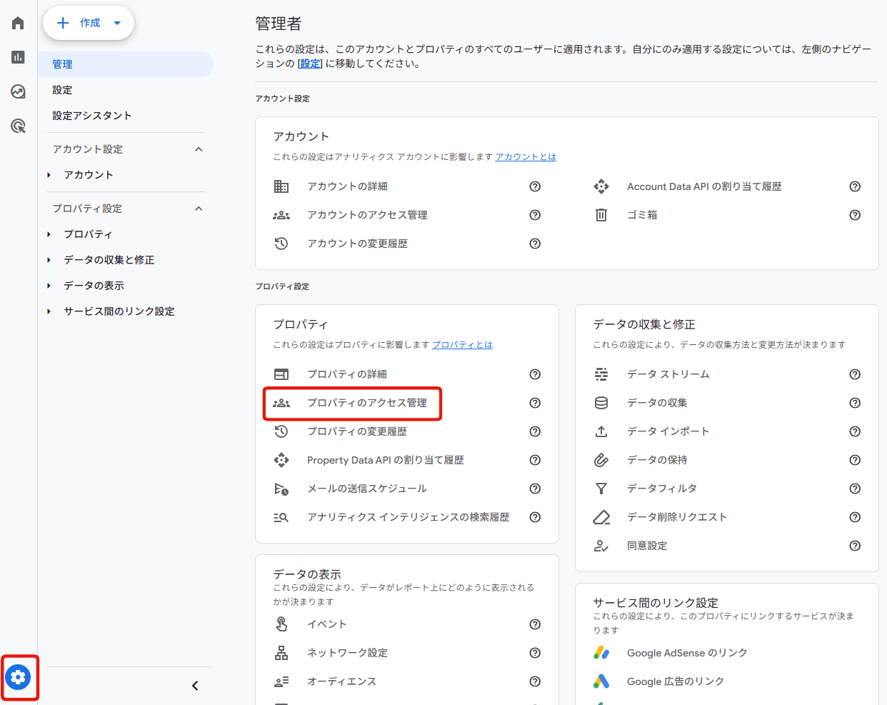 連携したいGA4プロパティの「管理」画面を開き、「プロパティのアクセス管理」を選択します。