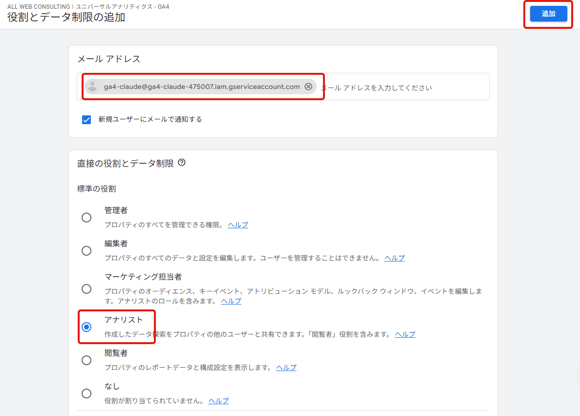 メールアドレスを貼り付けたら、標準の役割として「アナリスト」を選択し、右上の「追加」ボタンを押します。