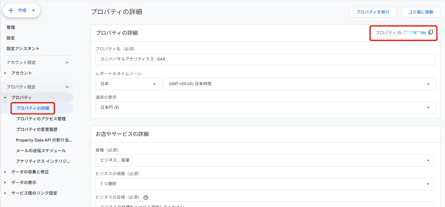 GA4の「管理」画面から、「プロパティ設定」内の「プロパティの詳細」を選択し、表示される「プロパティ ID」をコピーしてメモしておきます。