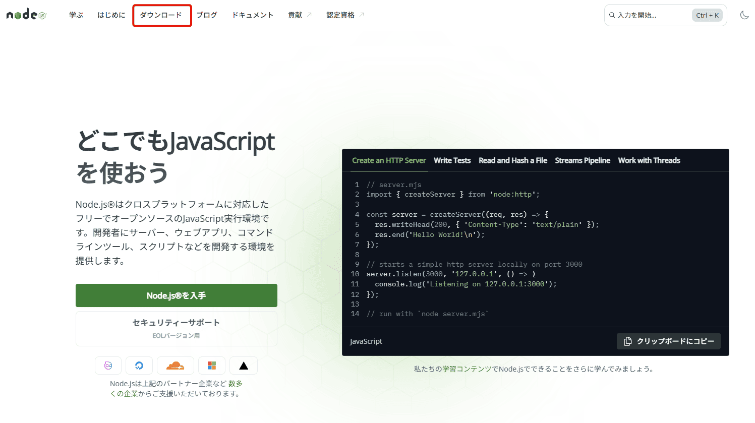 JavaScriptをサーバーサイドで実行するための実行環境ソフト、nodejs.orgにアクセスし、メニューから「ダウンロード」を選択します。