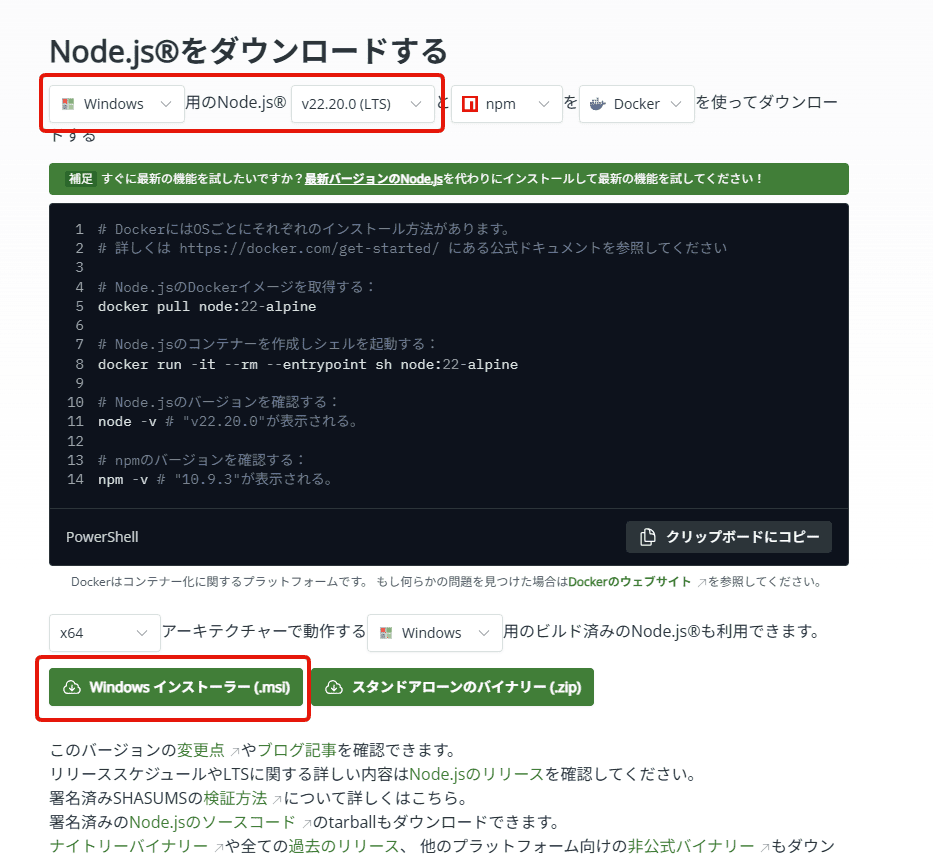お使いのOSを選び、「LTS」と記載のあるバージョン(安定版)のインストーラーをダウンロードします。