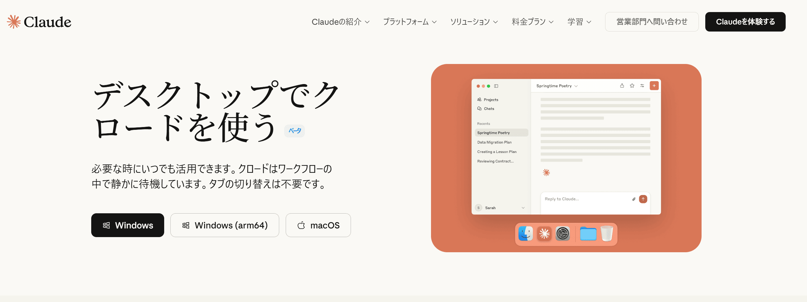 Claudeの公式サイトからデスクトップアプリをダウンロードし、インストールします。
