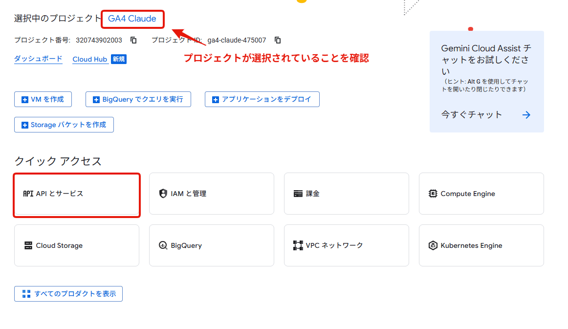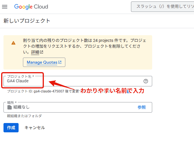 「プロジェクト名」に「GA4 Claude」など分かりやすい名前を入力し、「作成」をクリックします。