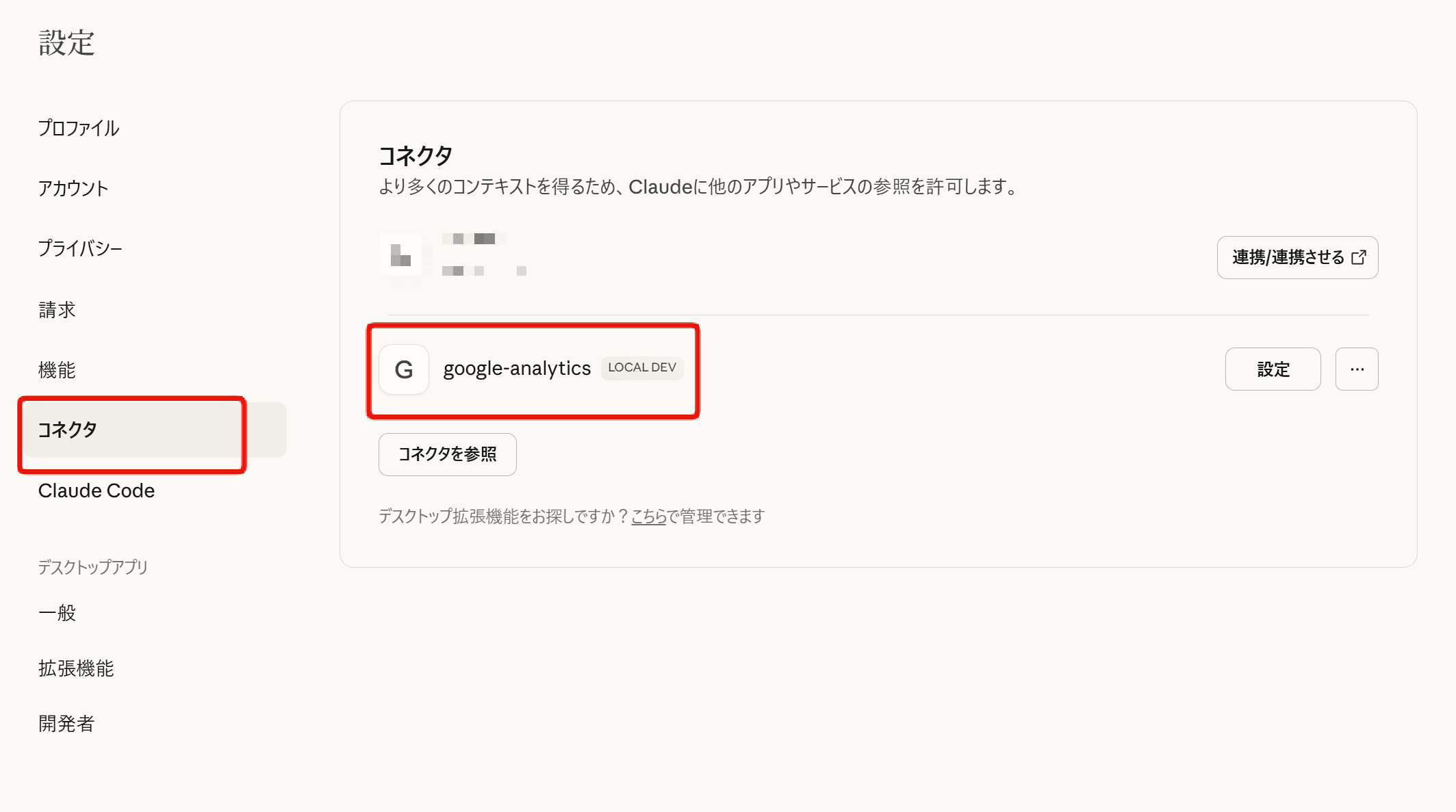 再度Claude Desktopを起動し、「設定」>「コネクタ」の画面を開きます。google-analyticsが「ローカル」として表示されていれば、すべての設定は完了です。