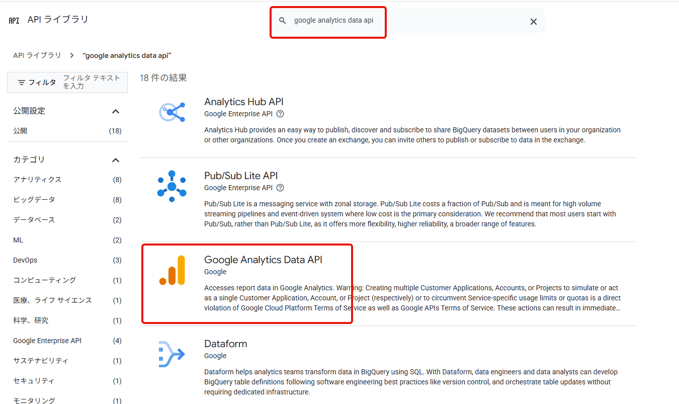 検索ボックスに「Google Analytics Data API」と入力して検索し、表示されたAPIを選択します。