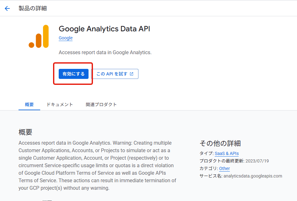 「有効にする」ボタンをクリックして、APIを有効化します。
