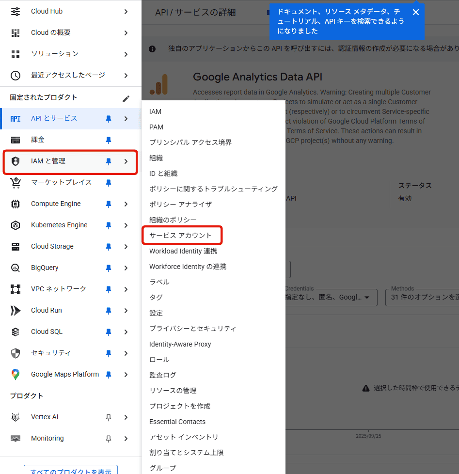 左側ナビゲーションメニューから「IAMと管理」>「サービスアカウント」を選択します。