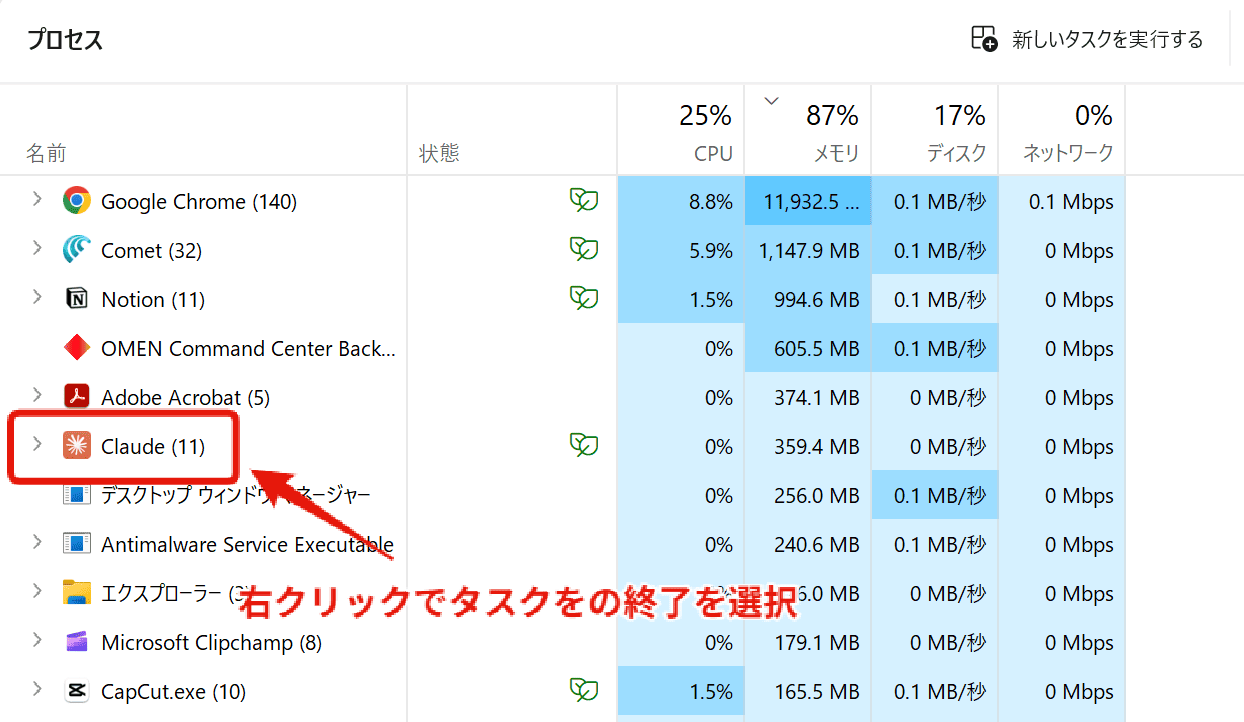 【完了前の重要ポイント】 設定を正しく反映させるため、Claudeを完全に終了させる必要があります。タスクマネージャー(Ctrl+Shift+Escで起動)を開き、Claudeのプロセスが残っていないか確認し、残っていれば「タスクの終了」を選んでください。