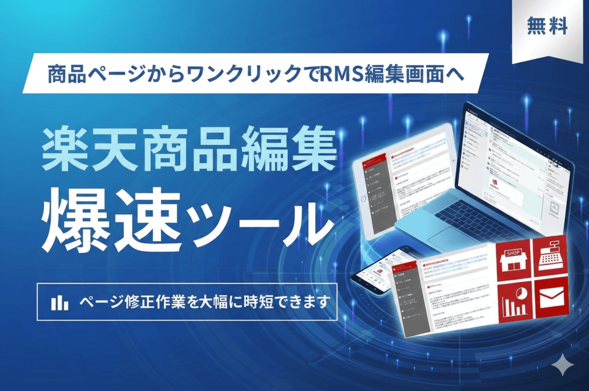 楽天市場の商品ページからワンクリックでRMS編集画面へジャンプできる無料ツール。ページ修正作業を大幅に時短できます。