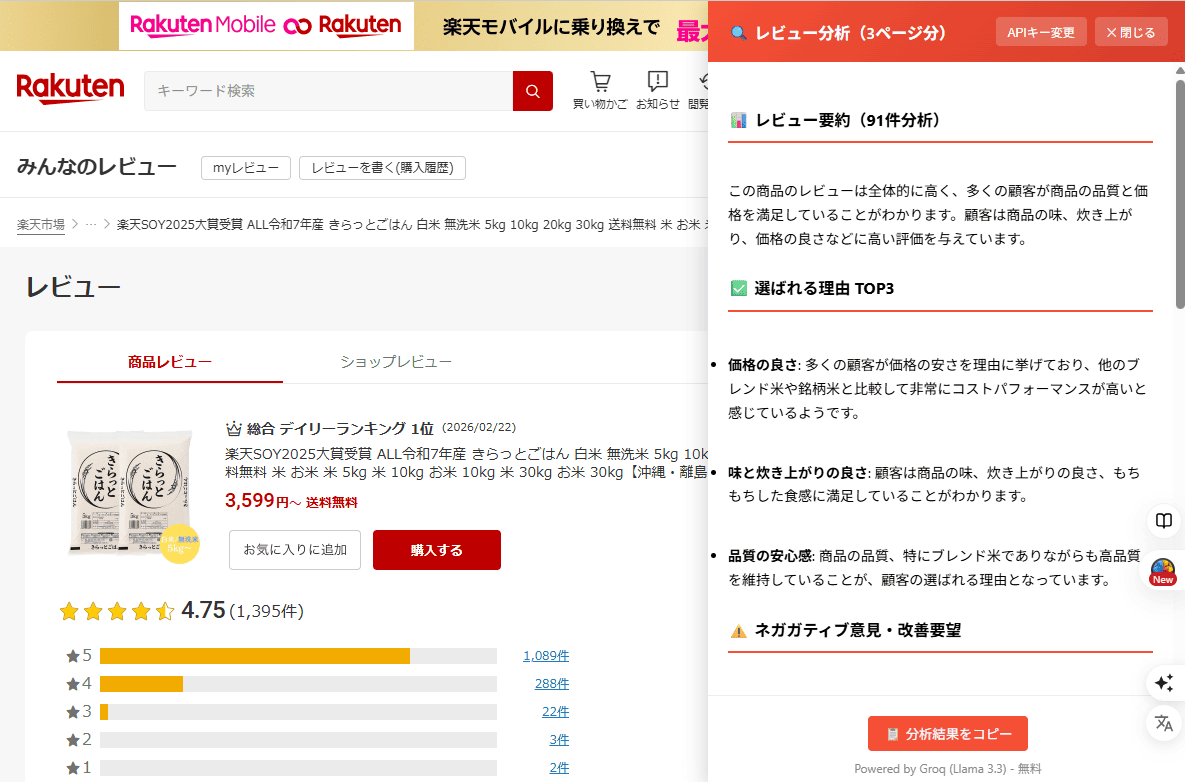 楽天市場の商品レビューをワンクリックでAI分析できる無料ツールです。